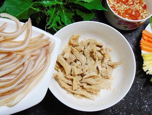 Nộm cuốn khi ăn phải chấm nước mắm pha sẵn và có thể ăn kèm bánh bột lọc cực ngon.