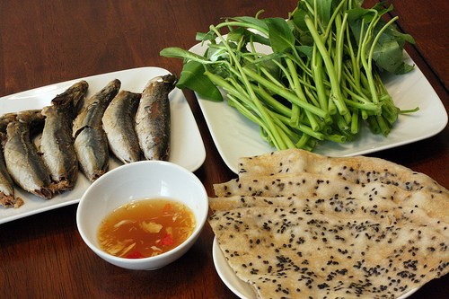 Món cuốn cá nục này thường ăn kèm với nước mắm chanh, tỏi, ớt pha hơi chua rất ngon miệng.